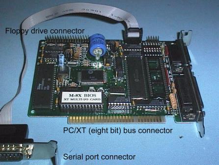 The Multi I/O card used in later PC/XT computers provides the Floppy Disk Drive Interface, one or two Serial Ports, Parallel Port, Games Port and a Real Time Clock.