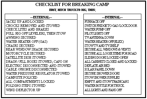 This is the checklist that I currently use. I use it every time I prepare to get underway and it keeps me from forgetting anything. If you don't currently use a checklist, I recommend that you start! This list has items on it that won't pertain to your specific rig and situation, but you can download the files and modify it to fit your needs. I printed mine and laminated it and keep it in the truck where it's readily accessable. Click on the files below to download.