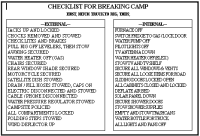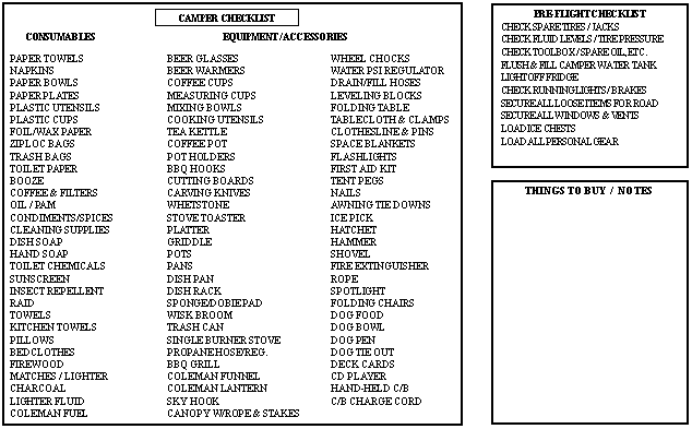 These are a couple of checklists that I used when I had a pickup camper and a boat. They reflect a lot of weekend camping equipment and boat-related gear, but they may give you some ideas.