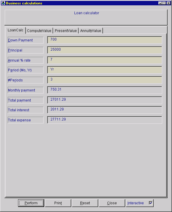 The following is the example REXX program that performs the loan computations associated with the first form tab above.