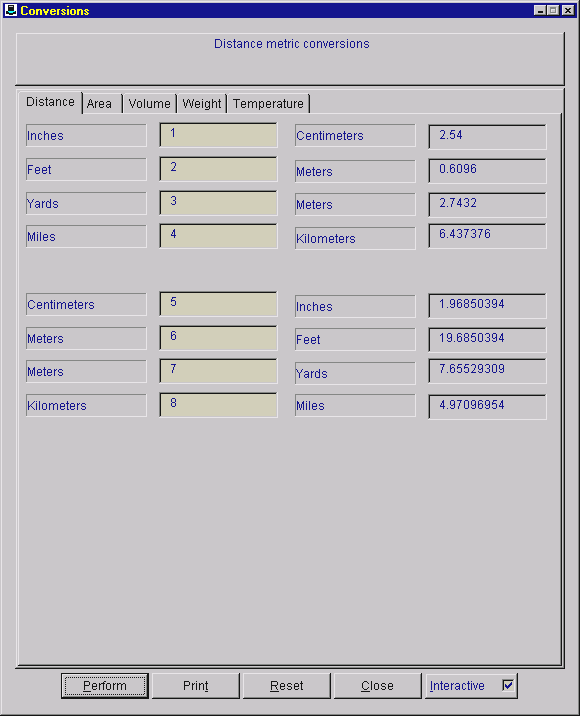 This example shows two helpful concepts. First, some fields do not have captions. This introduces spacing between fields, which helps the user distinguish groups of conversions. Second, the output values are presented on the right side of the form area. This is accomplished by providing the appropriate number of empty input field captions after the last visible field. The total number of input fields in the left column is 16. For consistency, empty output fields are also defined, so the total number of output fields in the right column is also 16.