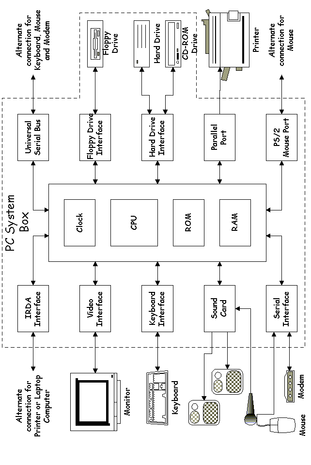 Click on the "thumbnail sketch of the following simple block diagram to get a larger image of it. This image will help you to understanding where the various parts of a typical PC Computer system fit. What you will see is too big to fit on the screen but should print in "landscape" mode when printed.
