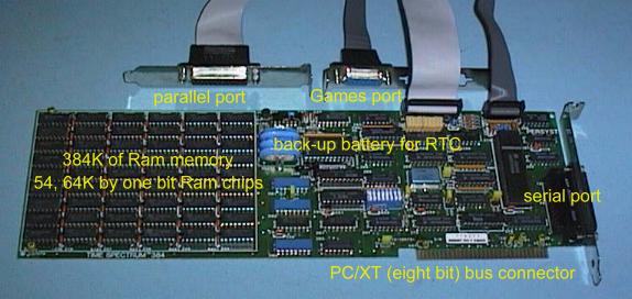 A common board fitted to the early PC/XT computers was the Multi Function card. This board was called by one manufacturer, a Six Pack. This card provided up to 384K of extra RAM memory, (required because early system boards could only accommodate 256K of RAM), Serial Port (and sometimes two Serial Ports), Parallel Port, Games Port and Real Time Clock.