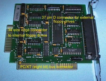 The Input/Output (I/O) functions were originally provided by individual cards. Here is an example of a floppy disk drive interface card.