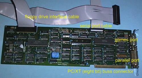 The Multi I/O card used in later PC/XT computers provides the Floppy Disk Drive Interface, one or two Serial Ports, Parallel Port, Games Port and a Real Time Clock.