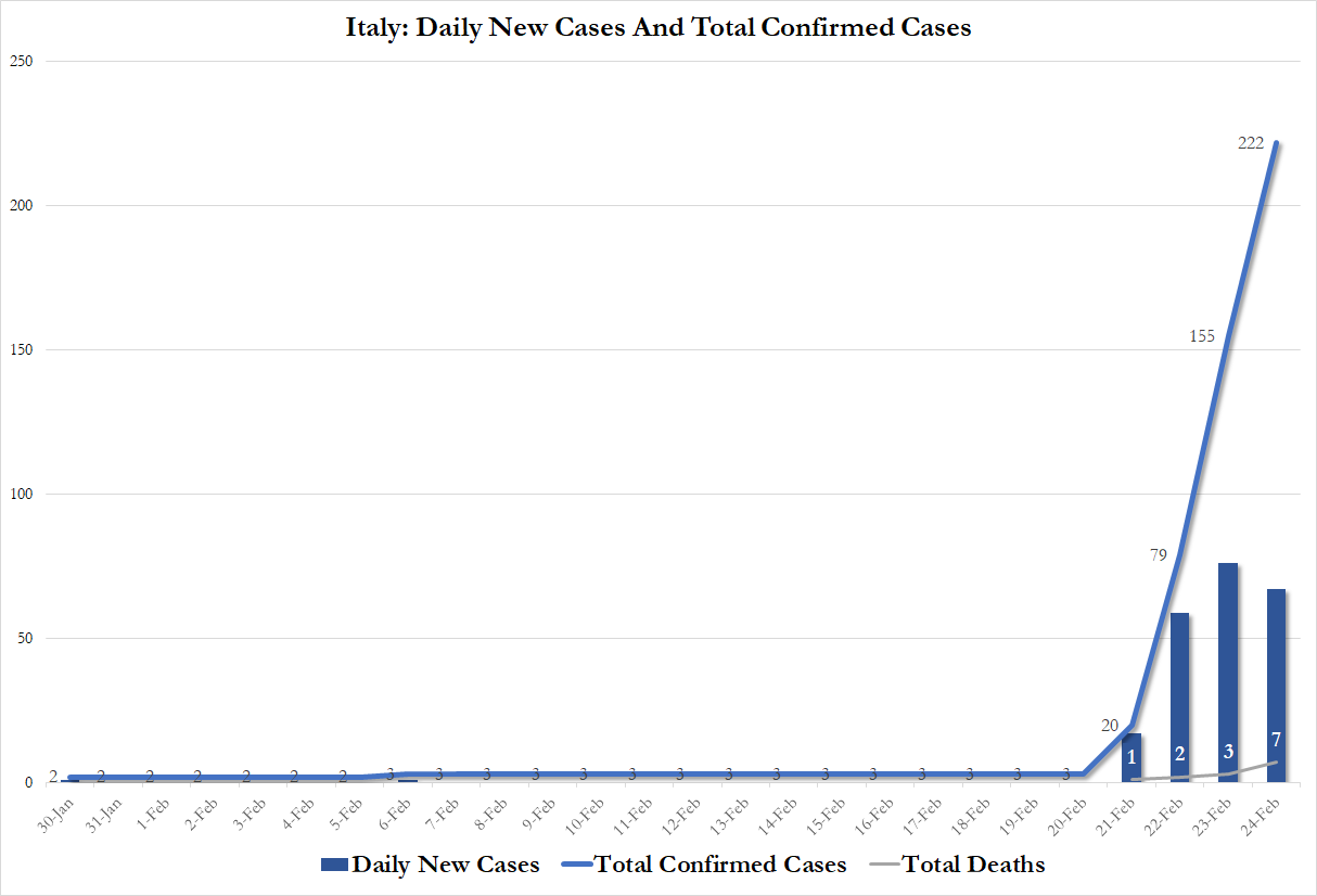 As we reported over the weekend, more than a dozen towns in Lombardy - the hardest hit region with 167 confirmed cases and 4 deaths - are on complete lockdown. According to the latest update, there are now 219 confirmed cases in Italy, as well as five deaths.