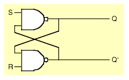 Note that if both S and R are one, then the Q output depends upon Q. That is, whatever Q happens to be, the top NAND gate continues to output that value. If Q was originally one, then there are two ones as inputs to the bottom flip-flop (Q nand R). This produces an output of zero (Q'). Therefore, the two inputs to the top NAND gate are zero and one. This produces the value one as an output (matching the original value for Q).