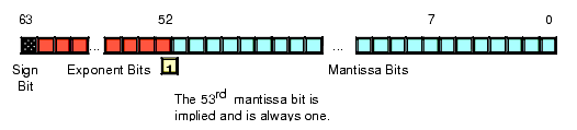 The double precision format helps overcome the problems of single precision floating point. Using twice the space, the double precision format has an 11-bit excess-1023 exponent and a 53 bit mantissa (with an implied H.O. bit of one) plus a sign bit. This provides a dynamic range of about 10±308and 14-1/2 digits of precision, sufficient for most applications. Double precision floating point values take the form shown in Figure 4.3.