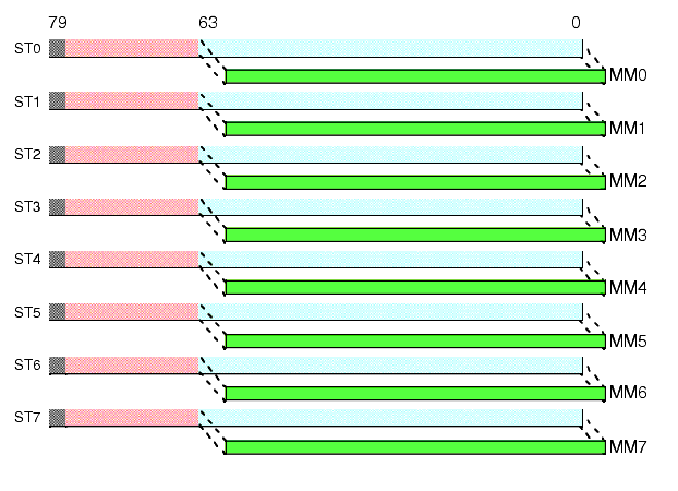 Of course, those operating systems have long since been upgraded and Microsoft (and Linux developers) could have easily provided a "service pack" to handle the new registers (had Intel chosen not to alias the FPU and MMX registers). So while aliasing MMX with the FPU provided a very short-lived and temporary benefit, in retrospect Intel made a big mistake with this decision. They've obviously realized their mistake, because as they've introduced new "streaming" instructions (the floating point equivalent of the MMX instruction set) they've added new registers (XMM0..XMM7) without using this trick. It's too bad they don't fix the problem in their current CPUs (there is no technical reason why they can't create separate MMX and FPU registers at this point). Oh well, you'll just have to live with the fact that you can't execute interleaved FPU and MMX instructions.