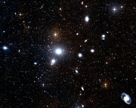 Se muestra a continacion una foto del centro del cluster Fornax. El cluster contiene un centro compacto que contiene muchas galaxias brillantes lo que lo hace ver mejor en las fotografias que al cluster Virgo. La galaxia eliptica brillante del centro es NGC 1399, y abajo a la derecha de la foto se puede ver a NGC 1365.