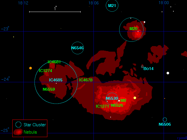This is a list of the nebulae in this region. The only major nebulae here are the Trifid and Lagoon nebulae. All of the other nebulae in this list are bright nebulous patches associated with the Lagoon nebula. The distance to the Trifid nebula is very uncertain. It is associated with a star cluster, but distance estimates to this star cluster vary enormously from 2700 to over 5200 light years. A distance of about 4000 light years is probably a reasonable distance for both the nebula and the star cluster.