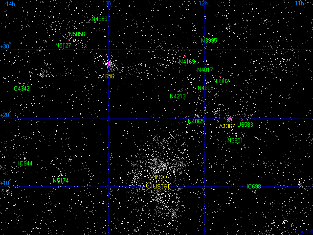 The Coma supercluster is a very famous supercluster. This map below is a plot of the brightest galaxies (from the Principal Galaxies Catalogue) in this region of the sky. Dominating this picture is the Virgo cluster - the nearest rich cluster in the universe and the dominant cluster in the the Virgo supercluster. Above the Virgo cluster and much further away are two much richer clusters - A1367 and A1656. These are the two main clusters in the Coma supercluster.