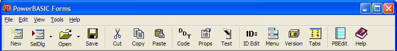 Firstly, the toolbar provides quick access to some frequently used PowerBASIC Forms features. The toolbar can be displayed in both small button and large button formats. In large button format, each button may also display a phrase describing the action performed by the button. Additionally, these buttons will display ToolTips too, if the mouse is made to hover over a toolbar button.
