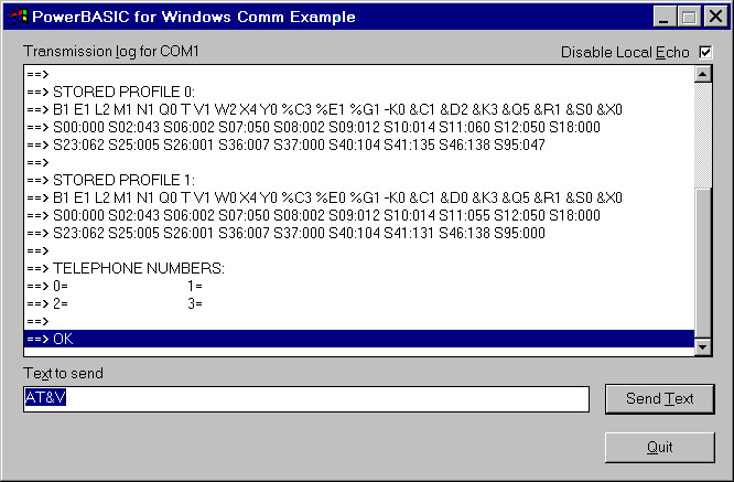 The final program can be found in the PB\SAMPLES\COMM folder of your PowerBASIC installation. It is not very large, but it handles a surprising number of ordinary communications tasks. It lacks some error checking, as has been noted. If you choose to modify this program, you might want to put some error checking in. You might also want to test for such problems as the List box control filling up to the limits of the operating system (i.e., 32767 entries in Windows 95/98/ME), and even add a few more buttons to send certain preformatted strings to modem, for example "ATZ" or "ATDT555-1234".