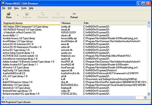 The PowerBASIC COM Browser has two views, a list of all registered type libraries installed on the system and a source code view which displays the PowerBASIC declarations for this type library. The PowerBASIC COM Browser opens up with a list of all the registered type libraries installed on the users system.